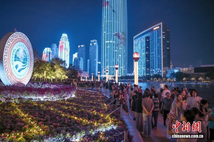 8月28日晚,市民和游客漫步天津海河畔,参观“2025上海合作组织峰会”主题花坛。中新社记者 佟郁 摄