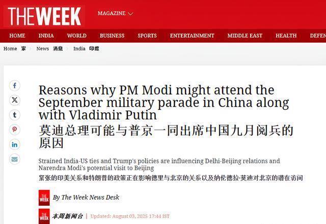 莫迪已经确认访华,参加8月31日—9月1日在天津举行的 上合组织峰会 。距离上次莫迪访华,已经过去了七年时间。在印度被美国加征50%关税的背景下,莫迪访华被人们更多地解读为寻求与中国的深度合作,共同对抗美国的关税政策。 本次上合组织峰会,距离“9·大阅兵”只隔了1-2天时间。莫迪完全在开完峰会后停留两天,直接参加大阅兵活动。正是因为如此,印度多家媒体认为莫迪应该参加中国的大阅兵活动。